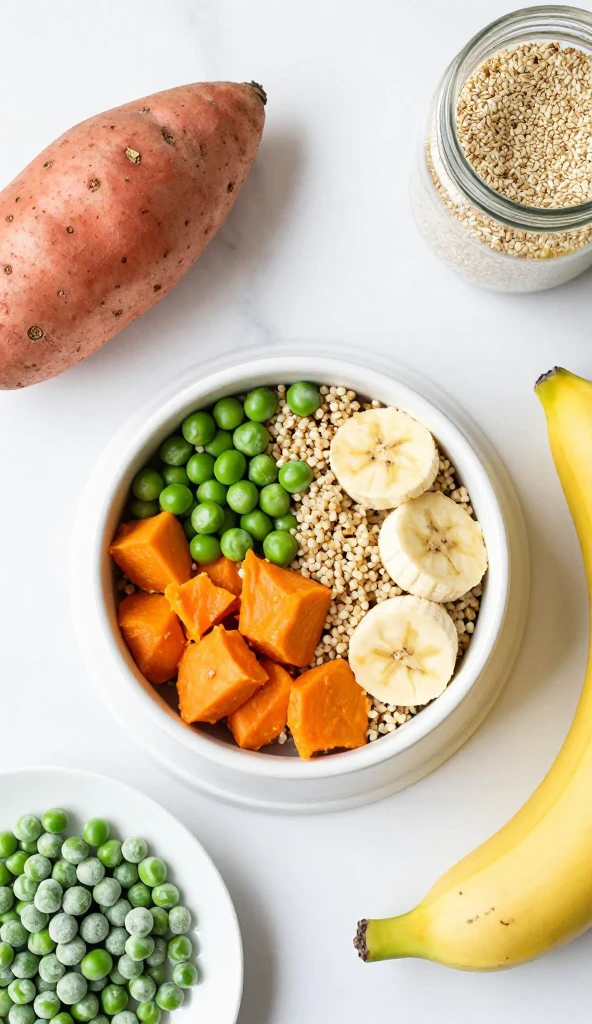 - In a large bowl, combine the cooked quinoa, mashed sweet potato, peas, and mashed banana. Mix well.
