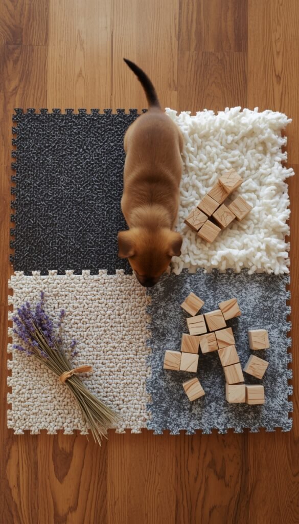 Puppies discover the world using their senses, and they have a designated sensory area to do just that. The idea is straightforward: collect items that will engage all of their senses, from texture to scent, and allow them to explore without fear. Examples include crunchy mats, rubber flooring, fluffy fleece, wood blocks, and fragrant plants such as rosemary or lavender in a smelling nook.