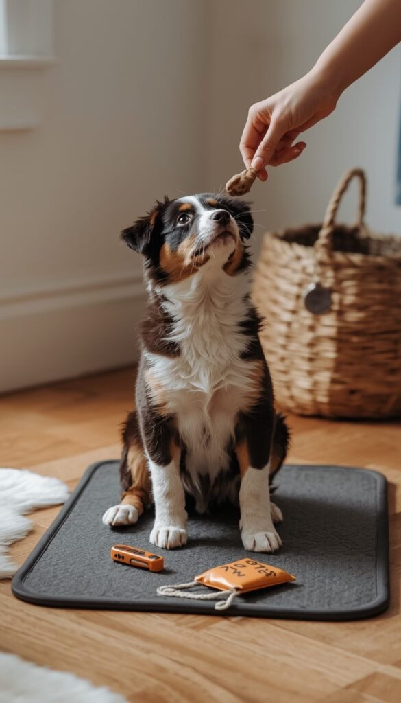 High-value treats (small, soft pieces) · Clicker · Non-slip mat so your pup doesn’t slide during sits and downs · A consistent verbal marker word · Timer on your phone to keep sessions short