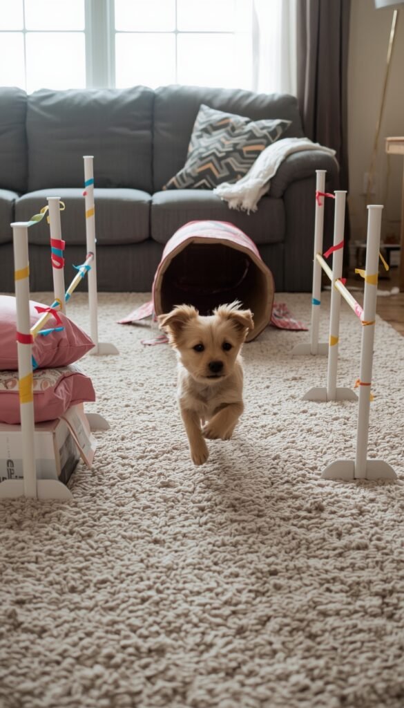 An indoor obstacle course sounds complicated but really isn’t. You can build a solid beginner course entirely from things you already own. Stack two couch cushions as a jump, set up dining chairs for weave poles, use a cardboard box as a tunnel, and add a folded blanket as a “pause table.” Done. You just built an agility course for free.