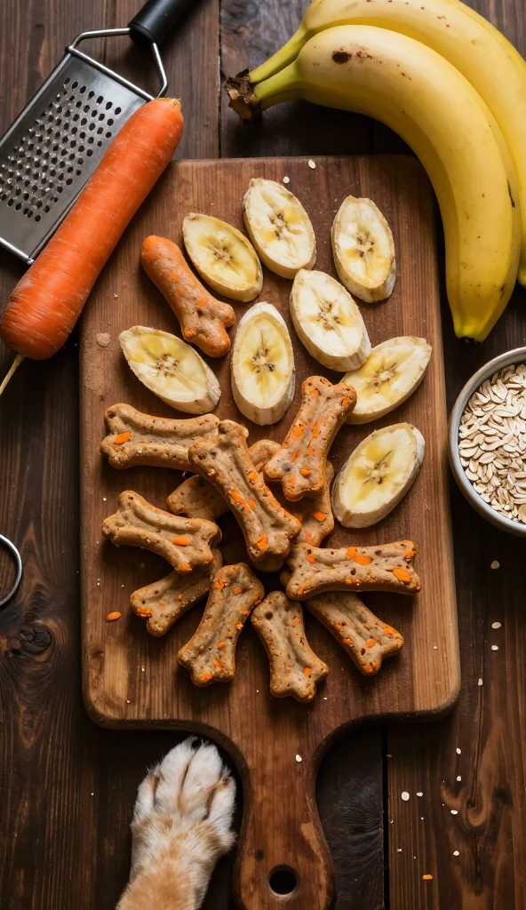Finely chop one medium-sized carrot and mix it into your dough. Carrots contain plenty of vitamin A and fibers, are crispy, and also low in calories, which makes them perfect to be eaten by overweight puppies. Bake in high heat for 13 to 15 minutes.